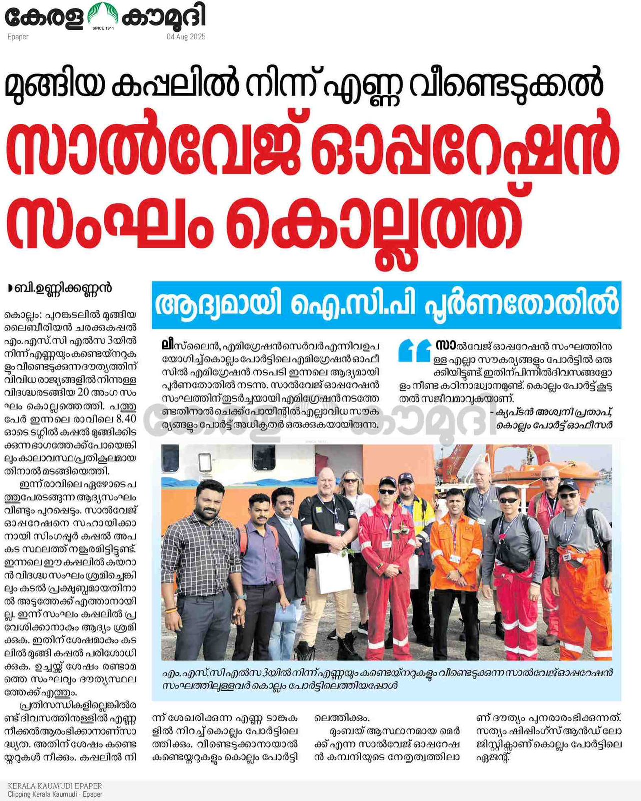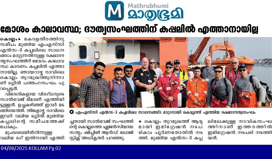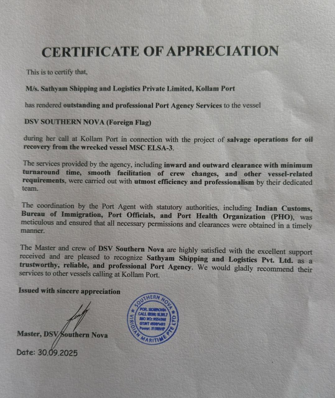 Sathyam Shipping & Logistics Pvt. Ltd. proudly served as the appointed Kollam Port Agents for MSC and MERC, providing dedicated operational support during the salvage operations of MSC ELSA-3.ππ’