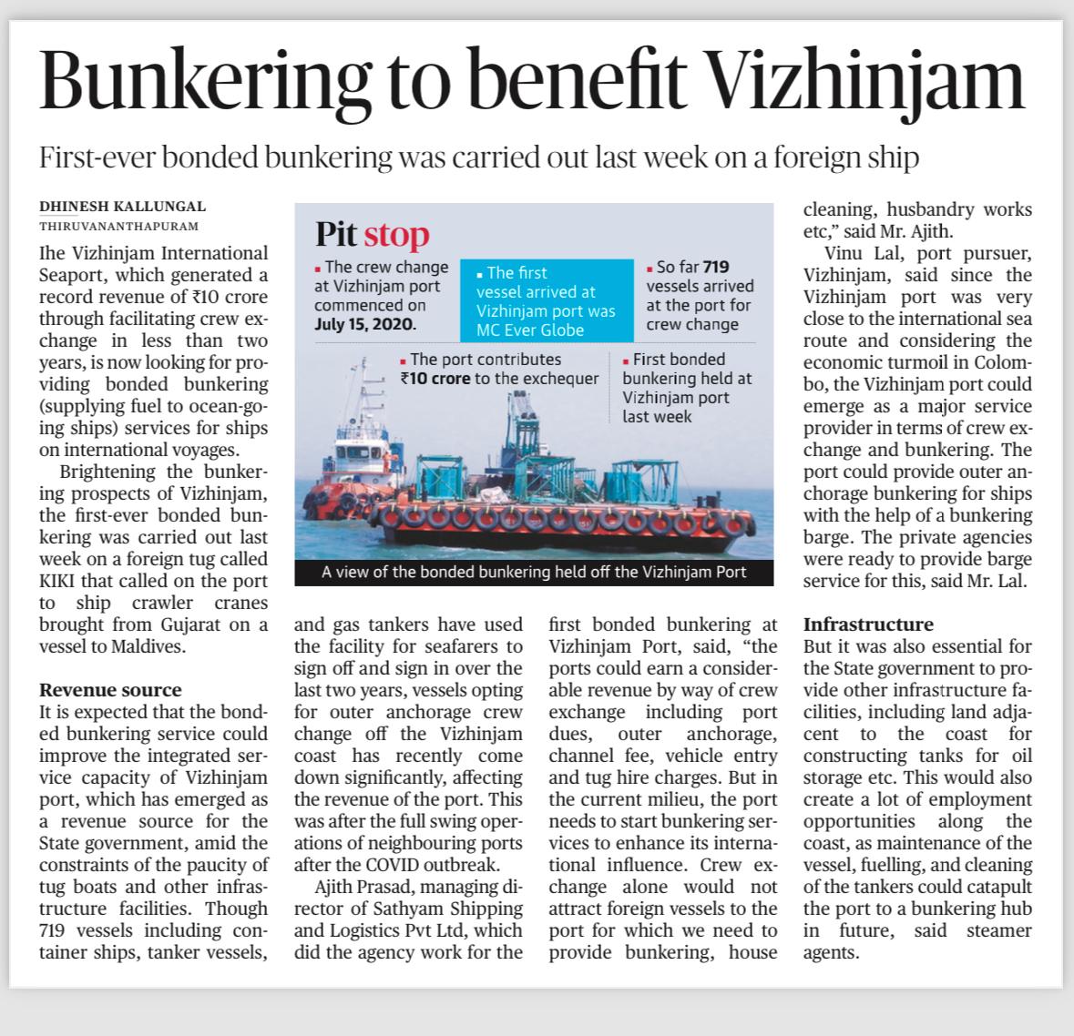 First time in history, bonded fuel bunkering was done for a foreign flag vessel at Vizhinjam Port in association with Indian Oil Corporation.
